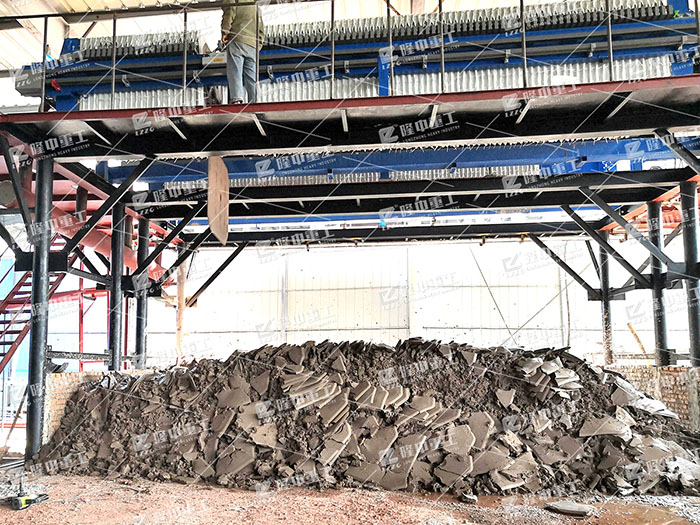 3、回收機溢流污水進入污水池,再通過三氫凈化體專用泵送至三氫凈化體進行濃密,經三氫凈化體濃密后的泥漿由壓濾機專用泵抽取,打入廂式壓濾機進行壓濾,并形成泥餅并干排;