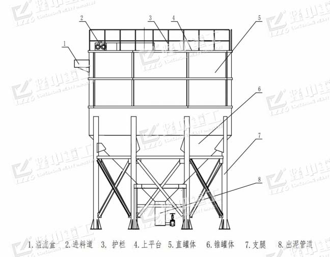 處理物料的廢水經過料道進入中心進料筒,并經過緩流、絮凝等一系列作用,使增稠的底流泥漿由罐體底部的出料口排出,并進入壓濾機等其他設備,壓濾成泥餅。罐體上部產生清潔度較高的清水(溢流澄清液),由頂部的出水口排出,清水可循環利用,實現生產廢水零排放。